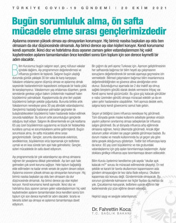 Toplantıda salgının seyri, genç nüfusun vakalar içindeki dağılımı, aşı programının son durumu ve influenza hakkında konuşulduğunu belirtti. Koca, Bilim Kurulu üyelerinin kendilerine "Okullar açık kalacak mı?" sorusu ile müracaat yapılmasından çok şikayetçi olduklarını belirterek , "Okulların kapanması söz konusu değildir, gündemimizde olmayacak" ifadeleriyle noktayı koydu.