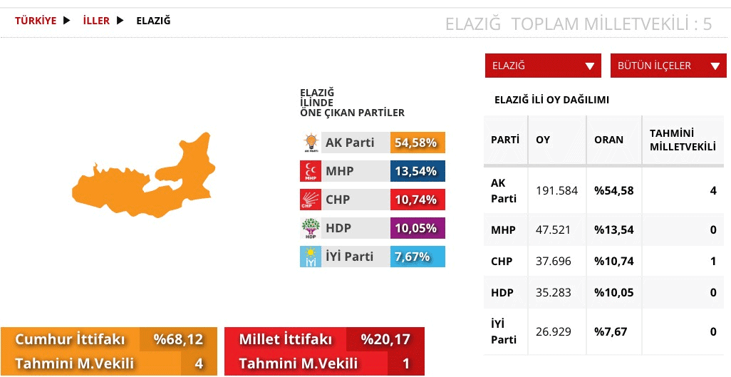 2018 Genel Seçimleri'nde, Elazığ'da ilginç bir olay yaşandı. MHP 47 bin oy aldığı halde milletvekili çıkaramadı. CHP ise 37 bin oy aldığı halde vekil çıkarabildi.
