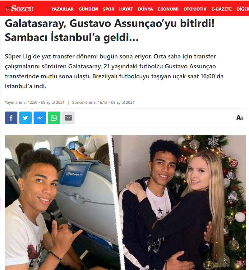 Galatasaray, 21 yaşındaki Brezilyalı futbolcu Gustavo Assunçao'nun transferini gerçekleştirdi. Sözcü gazetesi, sarı kırmızıların transferini haberleştirirken, yanında kim olduğu öğrenilemeyen ve haberle ilgisi olmayan bir kadının fotoğrafını kullanarak, spor haberini de magazinselleştirdi.