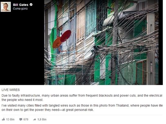 Teknoloji devi Microsoft şirketinin kurucusu Bill Gates, paylaştığı fotoğrafa düştüğü bir notla rezil oldu. Tayland'daki telefon kablolarının elektrik kablosu olduğunu ve insanların elektriğe ulaşabilmek için hayatlarını tehlikeye attığını iddia eden Gates'e Taylandlılar büyük tepki gösterdi, teknoloji devini tiye aldı.