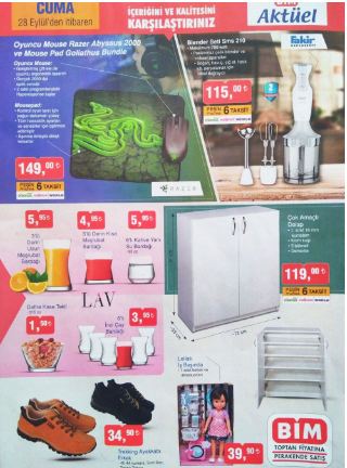 BİM 21 Eylül aktüel ürünler kataloğunda kumtel marka 3’lü ankastre set 6 taksit fırsatı ile 699 TL’ye satışa çıkarılıyor. Set içerisinde ankastre fırın, ankastre ocak ve davlumbaz yer alıyor. Phılıps marka erkek bakım sakal kesme aleti 69,50 TL’ye satışa çıkarılıyor. Fakir marka saç maşası 75 TL fiyatı ile, Fakir marka saç düzleştirici 75 TL fiyatı ile, klasik deri erkek ayakkabısı 39,90 TL fiyatı ile, fiyonklu kaymaz taban babet 12,90 TL fiyatı ile, kaymaz taban welsoft çocuk terlik 9,90 TL fiyatı ile, Tokalı terlik 7,95 TL fiyatı ile broşürde yer alıyor. Broşürde çocuklar da unutulmamış.