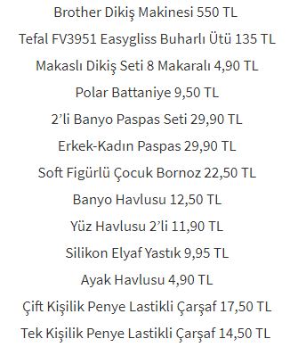 Birbirinden güzel oyuncakların yer aldığı katalog içerisinde oyuncak bateri fiyatı 24.90 TL’den, ses fonksiyonlu oyuncak bebek 35,50 TL’den satışa çıkarılıyor. Katalog içerisinde en çok dikkat çeken ürünler arasında Brother marka dikiş makinesi yer alıyor. Dikiş makinesi 6 taksit imkanı ile 550 TL’den satışa çıkarılıyor ve 2 yıl garantisi bulunuyor. Dikiş makinesi almayı düşünenler veya evde dikiş makinesi olanlar için de 4,90 TL’den makaslı, 8 makaralı dikiş seti satışa çıkarılıyor.