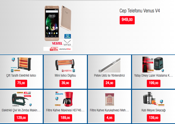 BİM 7 Aralık aktüel ürünler kataloğu haberleri yayınlandı. BİM bu hafta aktüel ürünler kataloğunda neler var? Uygun fiyatlı ve kaliteli ürünleri tüketicinin beğenisine sunan marketler zinciri her hafta Cuma günleri yeni ürünlere raflarında yer veriyor. Sınırlı sayıda aktüel ürünleri almak isteyenler açılış saatinde marketlere gidiyorlar. BİM 7 Aralık aktüel ürünler kataloğunda göze çarpan ürünler Venus V4 cep telefonu fiyatı 949 TL, Çift taraflı elektrikli ısıtıcı 75 TL, mini ısıtıcı Digitsu 39.90 TL, Yatay dikey lazer hizalama KLLZR112 199 TL, Elektrikli çivi ve zımba makinesi 129 TL.