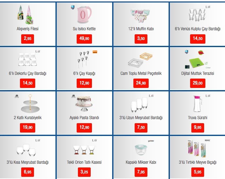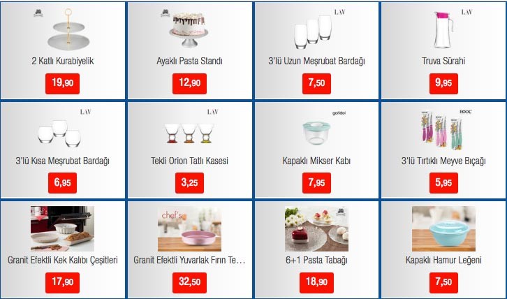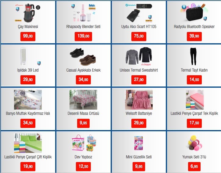 Çok Amaçlı Dolap 149 TL, Çay Makinesi 99 TL, Lastikli Penye Çarşaf Çift Kişilik 19.90 TL. Fakir kalitesi ile 2 kademeli ayarlanabilir hız fonksiyonu ve paslanmaz çelikten üretilmiş Rhapsody Blender Set yalnızca 139,00 TL. Gizli rezistans ile güvenli ve kolay temizlenebilme özelliği ve çift metal kontrol sistemi ile çift güvenlikli susuz kalma emniyeti sunan Premier Su Isıtıcı Kettle 49,90 TL. Otomatik kanal güncelleme ve ekranı 9 farklı kareye bölme fonksiyonu ile Hometech Uydu Alıcı Scart 75,00 TL. Müzik severlerin tercih ettiği Fm radyo, USB bellek ve Micro Sd kart girişi özelliği ile şarj edilebilir Bluetooth Speaker yalnızca 39,90 TL. 39 adet smd led, 120 mAh bataryası ve 2 tip aydınlatma seçeneği ile ışıldak 29,90 TL