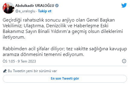 Ulaştırma ve Altyapı Bakanı Abdulkadir Uraloğlu, Twitter hesabından Binali Yıldırım'a geçmiş olsun dileklerini iletti.