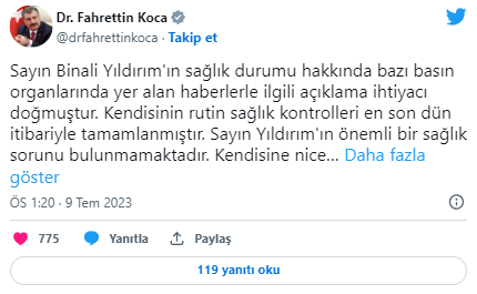 Sağlık Bakanı Fahrettin Koca'dan da Binali Yıldırım'ın sağlık durumuna ilişkin açıklama geldi. Koca, "Sayın Binali Yıldırım'ın sağlık durumu hakkında bazı basın organlarında yer alan haberlerle ilgili açıklama ihtiyacı doğmuştur. Kendisinin rutin sağlık kontrolleri en son dün itibariyle tamamlanmıştır. Sayın Yıldırım'ın önemli bir sağlık sorunu bulunmamaktadır. Kendisine nice sağlıklı günler dilerim." ifadelerini kullandı.