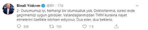 Korona testi pozitif çıkan Binali Yıldırım’ın sağlık durumu da merak ediliyordu. Binali Yıldırım kendisinin ve eşinin sağlık durumuna ilişkin de sevindiren haberi verdi. Binali Yıldırım, eşi ve kendisinin sağlık durumlarının iyi olduğunu ifade etti.