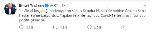 Memleketi Erzincan’da bulunan AK Parti Milletvekili Binali Yıldırım ve eşin koronaya yakalandığı iddia edilmişti. Bu iddianın doğru olup olmadığı merak edilirken, Binali Yıldırım sosyal medya hesabından son dakika açıklaması yaparak koronaya yakalandığını doğruladı. Binali Yıldırım yaptığı açıklamada, vücut kırgınlığı sebebiyle bu sabah eşi Semiha Yıldırım ile Ankara Şehir Hastanesi’ne başvurduklarını söyledi. Yıldırım, yapılan test neticesinde korona hem kendisinin hem de eşinin testlerinin pozitif çıktığı açıkladı.