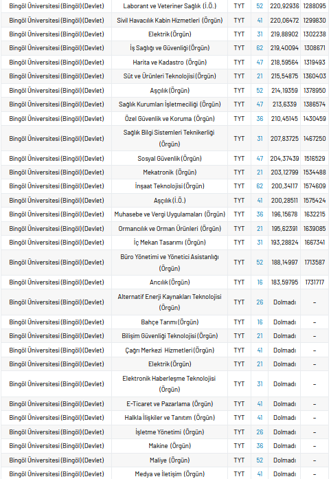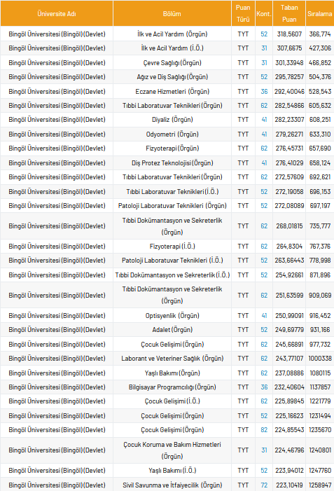 Bingöl Üniversitesi 2 yıllık taban puanları 2021, yüzdelik dilimleri ve kontenjan sayıları kaçtır?