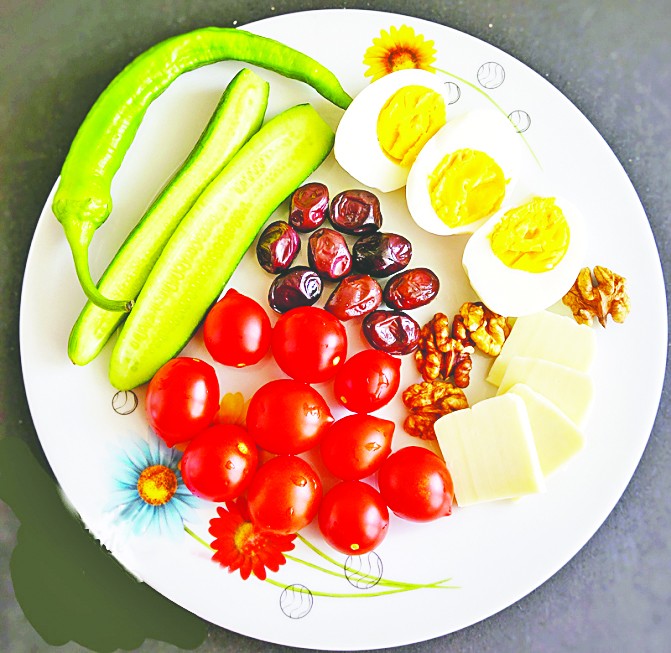Sağlıklı bir kahvaltı tabağı nasıl olur sorusuna cevap olarak bir örnek verelim. Tabakta gördüğünüz gıdalar yanında hiç ekmek yemeden doymanıza vesile olabilir. Haşlanmış yumurta iki adet. 3 olsa ne lazım gelir? Olabilir. Ama her şeyin ifratından kaçınmakta yarar var.