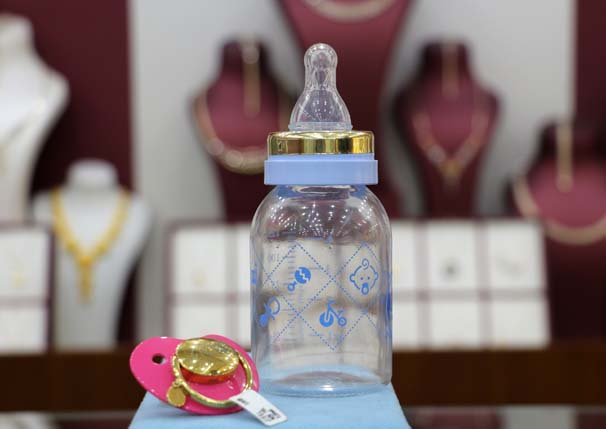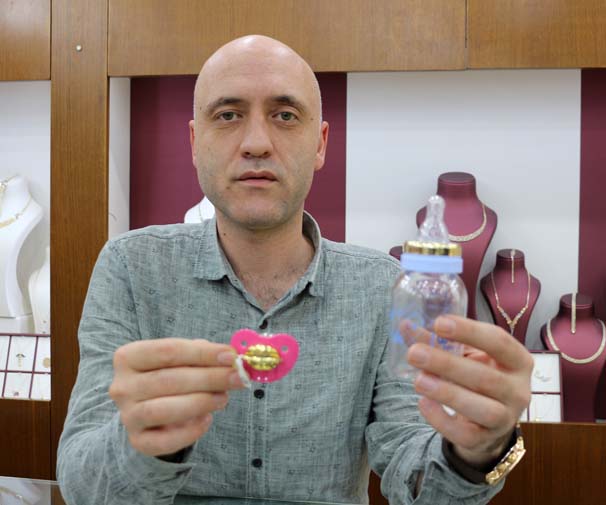 Kuyumcu Fatih Öksüz, son günlerde biberon ve emziğe talebin arttığını anlatırken, "Müşterinin isteğine göre özel üretim yapıyoruz. Burada kullanılan altın gramına göre hesaplanıyor ve müşteriye teslim ediyoruz. Raflarımızda da altın biberon ve emzik bulunduruyoruz. Müşterilerin ilgisini ve dikkatini çekiyor" dedi.