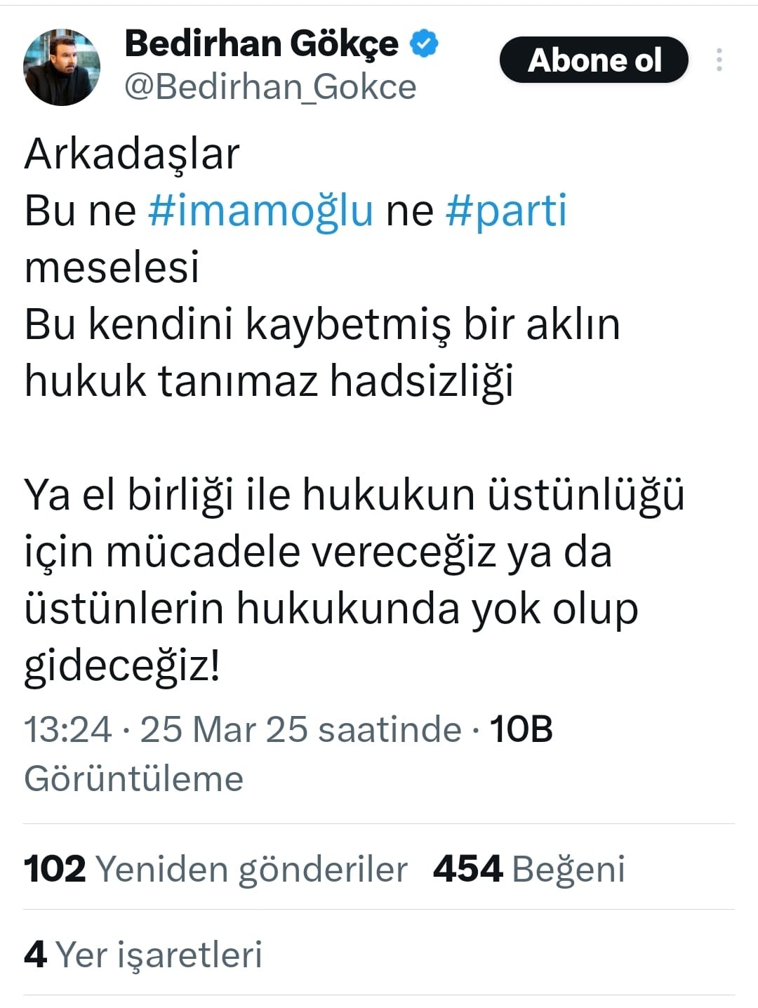 Bir süredir kamudan ihraç edilen KHK'lı FETÖ'cüler için yurtdışından ağıt yakan Gökçe, Ekrem İmamoğlu'nun tutuklandığı sürece ilişkin, "Bu ne İmamoğlu ne parti meselesi.. Ya el birliği ile hukukun üstünlüğü için mücadele vereceğiz ya da üstünlerin hukukunda yok olup gideceğiz" diyerek maskesini bir kez daha indirdi.