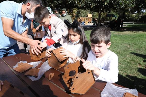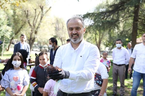 Yeni neslin daha çevreci, doğaya ve hayvanlara karşı duyarlı olmaları amacıyla farklı eğitim çalışmalarına imza atan Bursa Büyükşehir Belediyesi, küçük hayvan severleri 4 Ekim Hayvanları Koruma Günü’nde Bursa Hayvanat Bahçesi’nde bir araya getirdi. Büyükşehir Belediye Başkanı Alinur Aktaş’ın da katıldığı etkinlikte, Başkan Aktaş ve çocuklar ahşaptan kuş yuvası yaptı. Başkan Aktaş, yapılan ahşap kuş yuvalarını merdivene çıkarak ağaçlara asarken, etkinlikte ayrıca doğada yaralı olarak bulunan ve tedavileri Büyükşehir Belediyesi tarafından yapılan güvercinler de doğaya salındı.