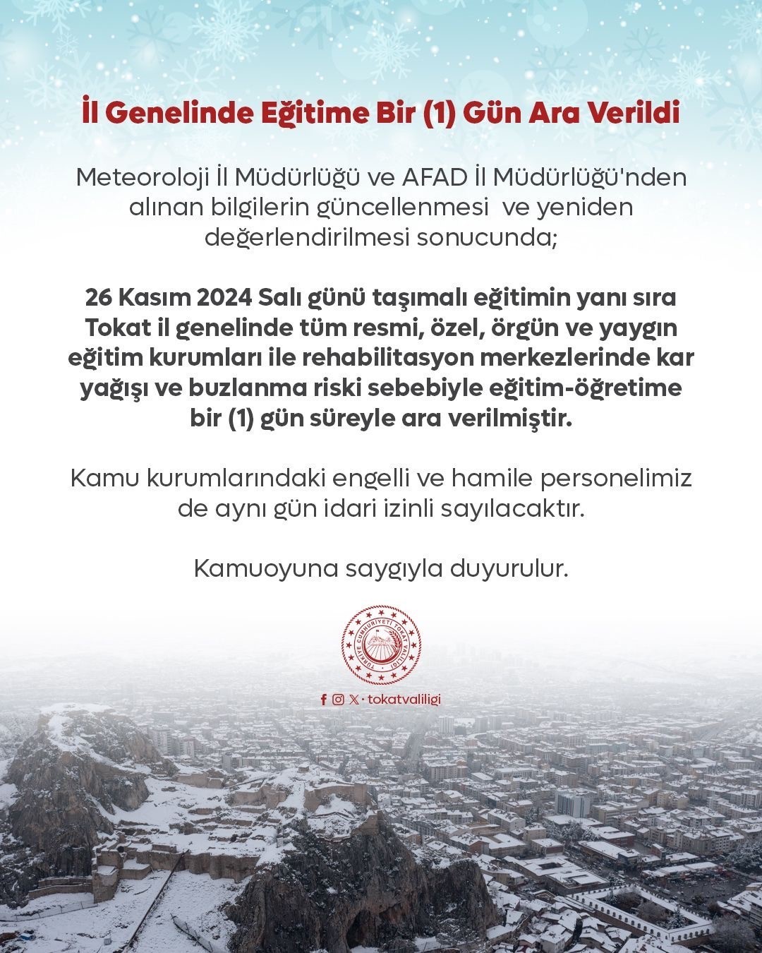 Tokat Valiliğinden yapılan açıklamada, “Meteoroloji İl Müdürlüğü ve AFAD İl Müdürlüğü’nden alınan bilgilerin güncellenmesi ve yeniden değerlendirilmesi sonucunda; 26 Kasım 2024 Salı günü taşımalı eğitimin yanı sıra Tokat il genelinde tüm resmi, özel, örgün ve yaygın eğitim kurumları ile rehabilitasyon merkezlerinde kar yağışı ve buzlanma riski sebebiyle eğitim-öğretime bir (1) gün süreyle ara verilmiştir. Kamu kurumlarındaki engelli ve hamile personelimiz de aynı gün idari izinlisayılacaktır” denildi.
