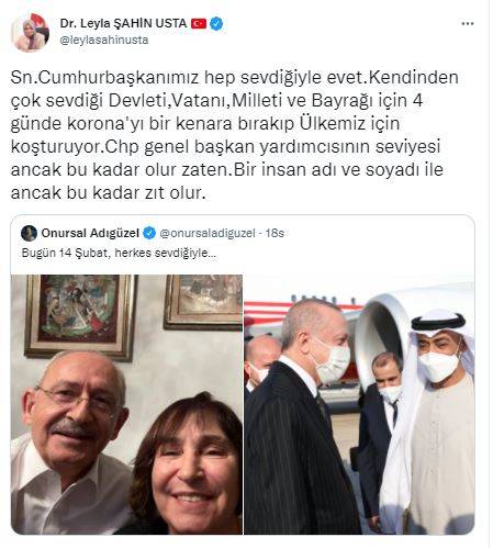 CHP Genel Başkan Yardımcısı ve İstanbul Milletvekili Onursal Adıgüzel'in CHP Lideri Kemal Kılıçdaroğlu'yla eşi ve Cumhurbaşkanı Erdoğan'ın BAE ziyareti karesini kıyaslayarak "Herkes sevdiğiyle…" notu düştüğü sosyal medya paylaşımına tepki gösteren AK Parti Genel Başkan Yardımcısı Leyla Şahin Usta, “Sn.Cumhurbaşkanımız hep sevdiğiyle evet. Kendinden çok sevdiği Devleti, Vatanı, Milleti ve Bayrağı için 4 günde koronayı bir kenara bırakıp ülkemiz için koşturuyor. CHP genel başkan yardımcısının seviyesi ancak bu kadar olur zaten. Bir insan adı ve soyadı ile ancak bu kadar zıt olur” dedi.