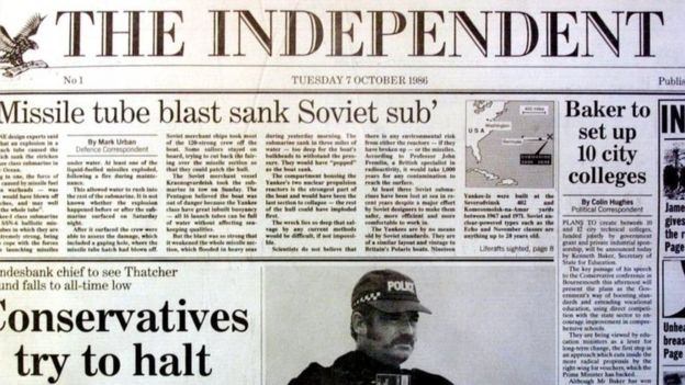 The Independent'ın 07-Ekim-1986 tarihli ilk sayısı. Takvimler 2010 yılını gösterdiğinde, Rus milyarder Alexander Lebedev, uzun bir süreden beri zarar açıklayan Independent News & Media'yı £1 karşılığında satın almıştı.