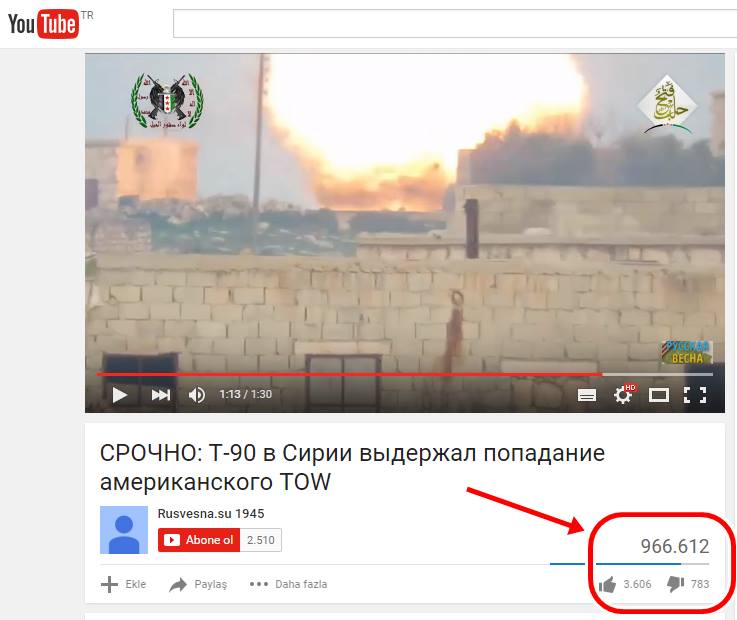 İki gün önce Halep'in batısındaki Şeyh Akil cephesinde muhalif Sukur El-Cebel birliği tarafından güdümlü füze ile vurulan bir T-90 tankına ait görüntüler Rusvesna adlı Rus haber ağında paylaşıldı. Paylaşılan videoyu bir milyona yakın Rus kullanıcı izledi.