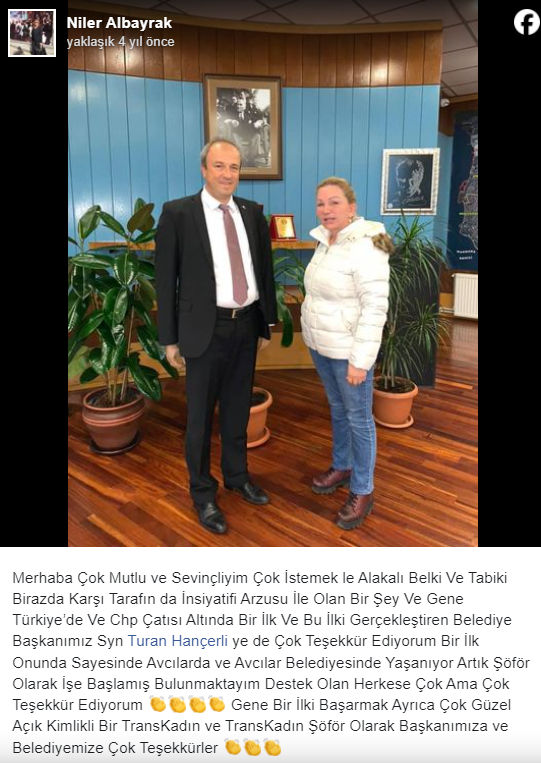 İlçe örgütünde iyice şımartılan sapkın trans, 2020 senesinde CHP Avcılar Belediyesi’nde belediye şoförü olarak işe sokuldu, bunu da utanmadan kendi sosyal medya hesabından paylaştı.