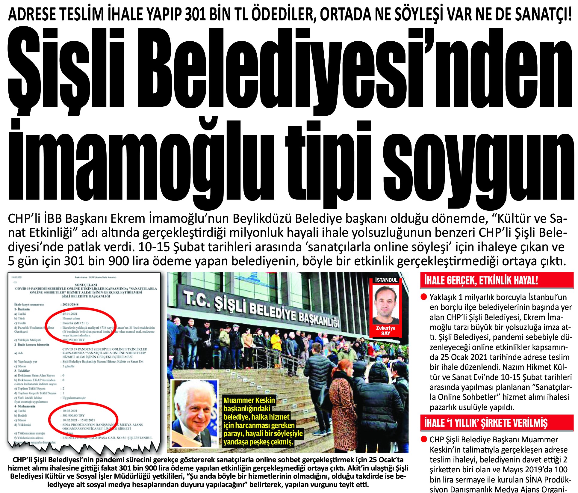 Akit’in 20 Şubat Cumartesi günü manşetten verdiği ‘Şişli Belediyesi’nden İmamoğlu tipi soygun’ haberi, Şişli Belediyesi’ni panikletti. Sanatçılarla online söyleşi için adrese teslim yapılan ama söz verilen tarihte gerçekleştirilmeyen ihaleyi savunmaya kalkışan CHP’li belediye gönderdiği tekzip metniyle bir yandan haberimizi doğrularken, diğer yandan kendilerinin 3 yalanını ifşa etti.
