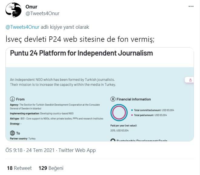 Onur isimli vatandaş, aldığı kaynağı da belirterek "İsveç devletinin fon verdiği kurum ve kuruluşlara bu siteden bakabilirsiniz. Türkiye'de fon verdikleri diğer kurumlar başka ülkelerden fon veren kuruluşlarda da gördüğümüz hep aynı isimler; https://openaid.se/en/explore-aid/countries-and-regions" ifadelerini kullandı.