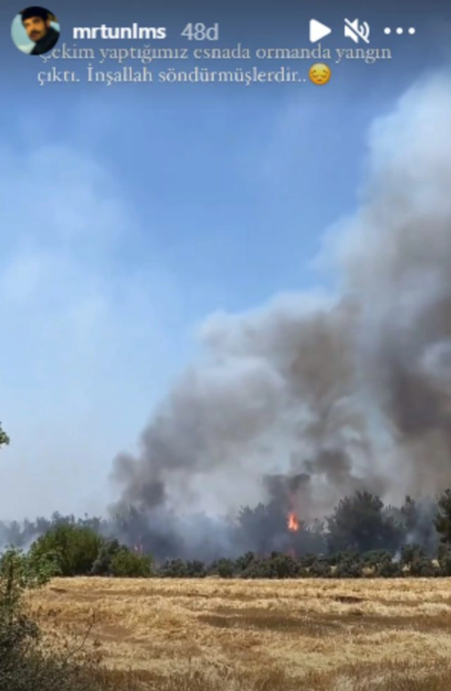 Murat Ünalmış o anları paylaşarak, "Çekim yaptığımız esnada ormanda yangın çıktı. İnşallah söndürmüşlerdir..." diyerek üzüntüsünü belirtti.