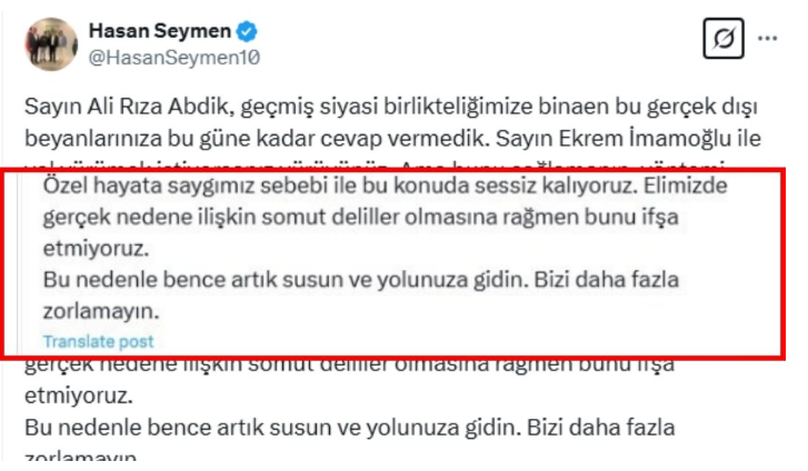 Söz gazetesinden Aykut Metehan'ın haberine göre, sosyal medyadan paylaştığı mesajda Abdik’in partiden gönderilme sebebinin Ekrem İmamoğlu ile çektirdiği fotoğraflar olmadığını söyleyen Seymen, partimizden uzaklaştırılma sebebinizi gayet iyi biliyorsunuz diyerek, “Elimizde gerçek nedene ilişkin özel hayata ilişkin somut deliller olmasına rağmen bunu ifşa etmiyoruz. Bu nedenle bence artık susun ve yolunuza gidin. Bizi daha fazla zorlamayın.” İfadesini kullandı