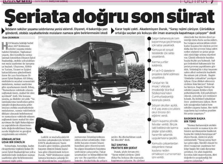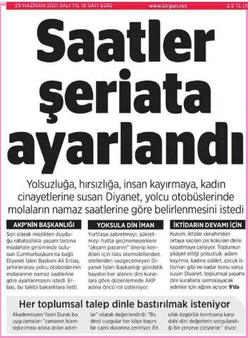 İslam'a olan nefret ve düşmanlığıyla tanınan solak Birgün gazetesi rezil bir habere daha imza attı. Diyanet İşleri Başkanlığı'nın şehirler arası otobüs yolculuklarında molaların namaz vakitleri dikkate alınarak düzenlenmesi yönündeki talebini haberleştiren Birgün kokuşmuş zihniyetini ortaya koydu. İslam dinine alenen hakaret eden Birgün yaptığı skandal haberde "Diyanet iktidar cenahından ortaya saçılan pis kokuları din ile kapatmaya çalışıyor" ifadelerini kullandı.