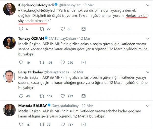 CHP lideri Kemal Kılıçdaroğlu'nun herkesin tek bir söylemde olması gerektiğini istemesinden sonra CHP milletvekilleri aynı tweetleri atmaya başladı.