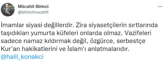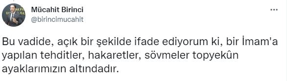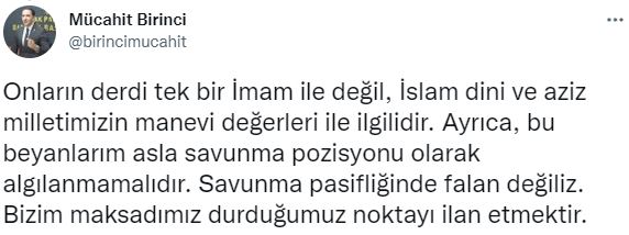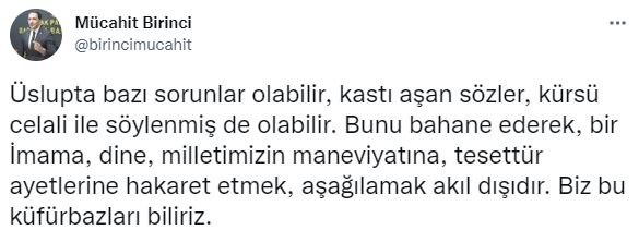 Son olarak AK Parti MKYK Üyesi Mücahit Birinci sosyal medya hesabı üzerinden dikkat çeken açıklamalar yaptı. Birinci yaptığı paylaşımlarda, “İmamlar siyasi değillerdir. Zira siyasetçilerin sırtlarında taşıdıkları yumurta küfeleri onlarda olmaz. Vazifeleri sadece namaz kıldırmak değil, özgürce, serbestçe Kur'an hakikatlerini ve İslam'ı anlatmalarıdır. Üslupta bazı sorunlar olabilir, kastı aşan sözler, kürsü celali ile söylenmiş de olabilir. Bunu bahane ederek, bir İmama, dine, milletimizin maneviyatına, tesettür ayetlerine hakaret etmek, aşağılamak akıl dışıdır. Biz bu küfürbazları biliriz. Onların derdi tek bir İmam ile değil, İslam dini ve aziz milletimizin manevi değerleri ile ilgilidir. Ayrıca, bu beyanlarım asla savunma pozisyonu olarak algılanmamalıdır. Savunma pasifliğinde falan değiliz. Bizim maksadımız durduğumuz noktayı ilan etmektir. Bu vadide, açık bir şekilde ifade ediyorum ki, bir İmam'a yapılan tehditler, hakaretler, sövmeler topyekûn ayaklarımızın altındadır” dedi.