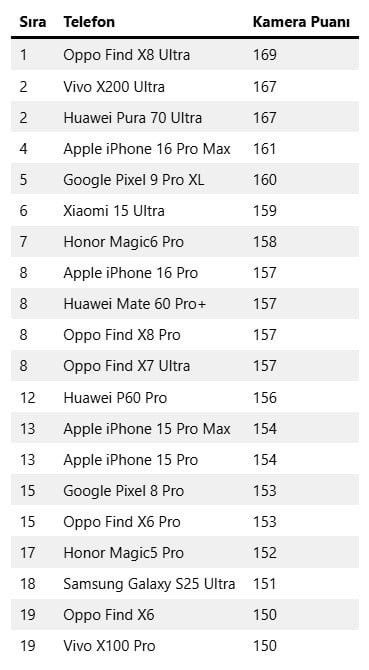 DxOMark genel kamera sıralaması ise şu şekilde;