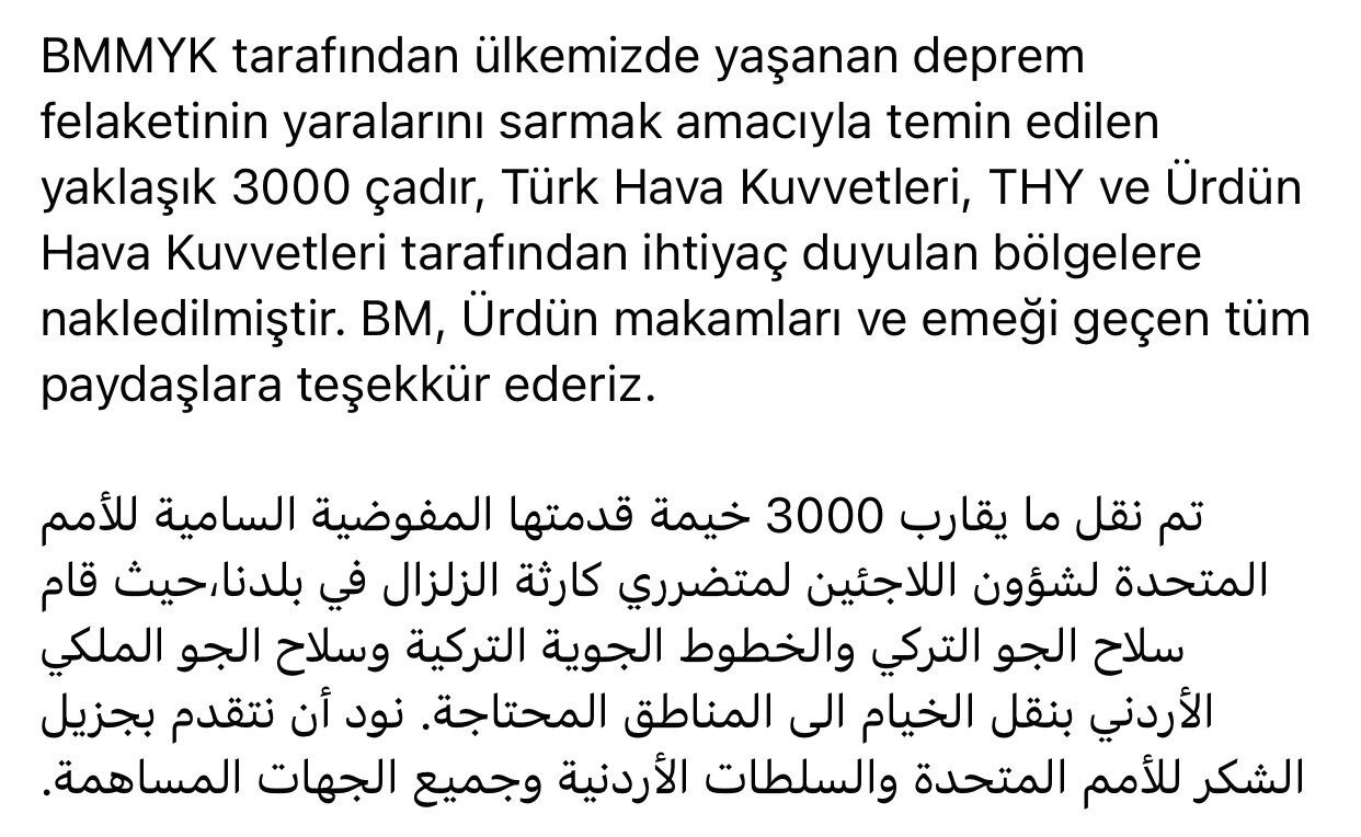 Türkiye'nin Amman Büyükelçiliği tarafından yapılan açıklamada, "BMMYK tarafından ülkemizde yaşanan deprem felaketinin yaralarını sarmak amacıyla temin edilen yaklaşık 3 bin çadır, Türk Hava Kuvvetleri, THY, ve Ürdün Hava Kuvvetleri tarafından ihtiyaç duyulan bölgelere nakledilmiştir. BM, Ürdün makamları ve emeği geçen tüm paydaşlara teşekkür ederiz" ifadeleri kullanıldı.