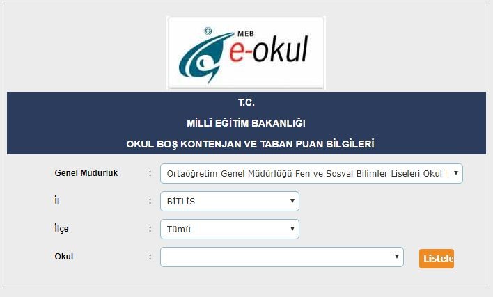 MEB e okul üzerinden 2018 2019 lise tercih dönemi başlattı Liselere Giriş Sınavı LGS 2018 sonuçlarının açıklanmasının ardından liselere yerleşmek için binlerce öğrenciyi şimdi de tercih heyecanı sardı. LGS sonuçlarının açıklanmasıyla birlikte gözler liselerin taban puanları ve yüzdelik dilimlerine çevrilmişti. Bitlis liseler 2018 taban puanlarını ve yüzdelik dilim YEP puanlarını MEB e Okul üzerinden açıkladı.