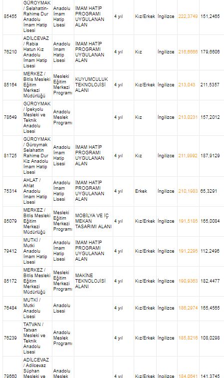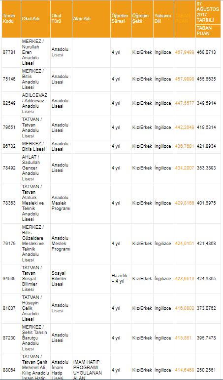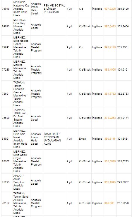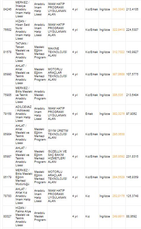İŞTE BİTLİS LİSELERİ 2018 2019 TABAN PUANLARI VE KONTENJANLARI