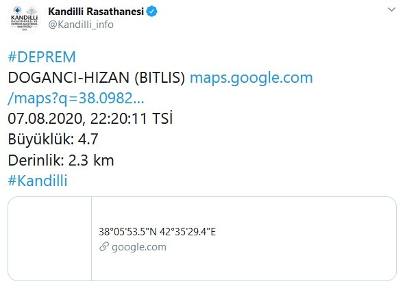 Kandilli Rasathanesi'nde yer alan bilgiye göre, Bitlis'in Hizan ilçesinde saat 22.20'de 4.7 büyüklüğüne deprem meydana geldi.