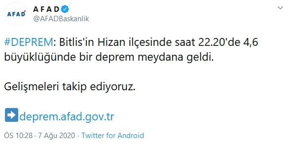 AFAD ise depremin büyüklüğünü 4.6 olarak belirtti.