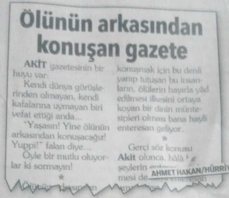 Akit gazetesinin bir huyu varmış... Kendi dünya görüşünden olmayan, kendi kafasına uymayan biri öldüğünde, arkasından hemen konuşmaya başlıyormuş.
