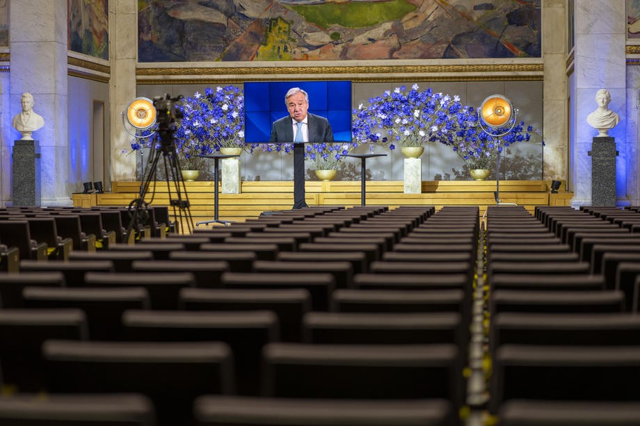 BM Genel Sekreteri Antonio Guterres, her yıl düzenlenen Nobel Barış Ödülleri’ne video mesaj yöntemi ile katıldı. Guterres mesajında, dünyanın koronavirüs salgını karşısında dünyanın "ortak bir düşmanla" karşı karşıya olduğunu ifade etti. "Ne yazık ki, hükümetler bu küresel tehdide ortak bir yanıt vermediler" ifadelerini kullanan Guterres, Dünya Sağlık Örgütü (DSÖ) tarafından sağlanan gerçekler ve bilimsel rehberliğin koordineli küresel eylemin temeli olması gerektiğini vurguladı.