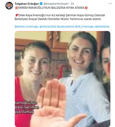 İstanbul’daki belediyeleri adeta eş dost, akraba çiftliğine çeviren CHP’li İmamoğlu’nun şimdi de daha önce başkanlığını yaptığı Beylikdüzü Belediyesi’nın Sağlık İşleri Müdürlüğünde çalışan baldızını, Boğaz'a yakın olsun diye Üsküdar Belediyesi’ne getirdiği ortaya çıktı. CHP’ye yakınlığıyla bilinen Tolgahan Erdoğan’ın iddiasına göre, İmamoğlu’nun eşi Dilek Kaya İmamoğlu'nun kız kardeşi Şeriman Kaya Gümüş’ün, Üsküdar Belediyesi Sosyal Destek Hizmetler Müdür Yardımcısı olarak atandığı öne sürüldü. Skandal atama, her fırsatta liyakatten dem vuran İmamoğlu’nun nasıl kural tanımadığını ve tek sermayesinin kızarmaz bir yüz olduğunu bir kez daha gözler önüne serdi.