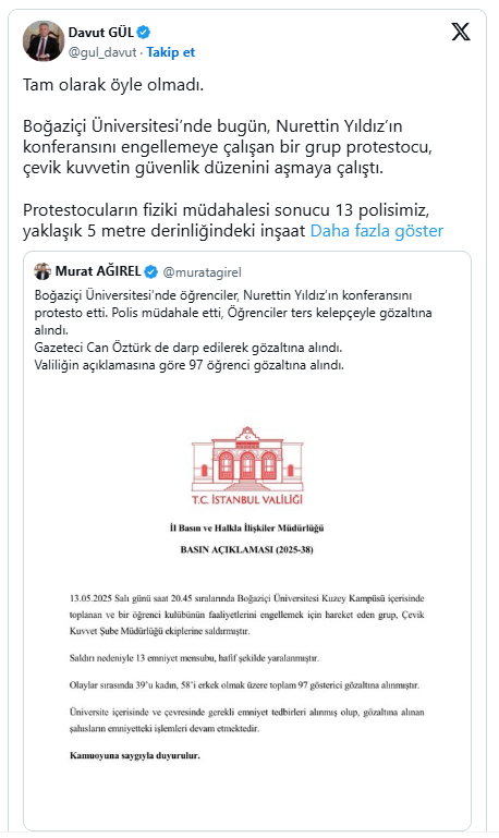 "Boğaziçi Üniversitesi'nde bugün, Nurettin Yıldız'ın konferansını engellemeye çalışan bir grup protestocu, çevik kuvvetin güvenlik düzenini aşmaya çalıştı. Protestocuların fiziki müdahalesi sonucu 13 polisimiz, yaklaşık 5 metre derinliğindeki inşaat çukuruna düşerek yaralandı. Olayla ilgili 97 kişi gözaltına alındı."