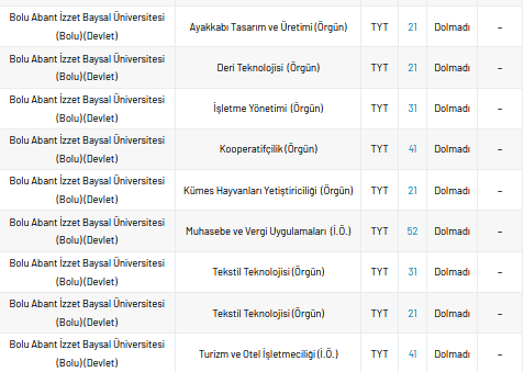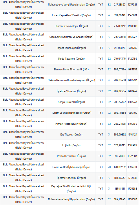 Bolu Abant İzzet Baysal Üniversitesi 2 yıllık taban puanları 2021, yüzdelik dilimleri ve kontenjan sayıları kaçtır?