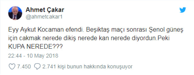 "Eyy Aykut Kocaman efendi. Beşiktaş maçı sonrası Şenol Güneş için çakmak nerede, dikiş nerede, kan nerede diyordun. Peki kupa nerede?" diye yazdı.