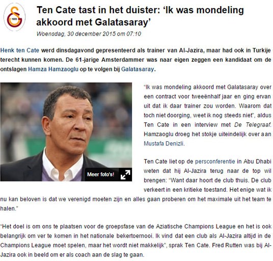 Hamza Hamzaoğlu'nun ardından gelecek ismin kendisi olduğunu belirten Ten Cate, "Galatasaray ile 2.5 yıllık bir kontrat üzerinde sözlü olarak anlaşmıştık ve ben takımın yeni teknik direktörü olacaktım. Ancak ondan sonra neden işler ilerlemedi, hâlâ anlamış değilim" dedi.