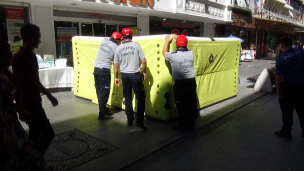 Atlayacağını söyleyerek etrafa bağıran Mehmet C.'nin çatıdan aşağıya taş attığını görenler polise haber verdi. İhbar üzerine olay yerine itfaiye, sağlık ve çok sayıda polis ekibi sevk edildi. Polis bölgede güvenlik önlemi alırken, itfaiye erleri de havalı branda açtı.