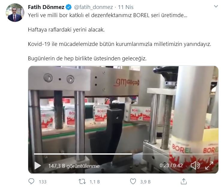 "Yerli ve milli bor katkılı el dezenfektanımız BOREL seri üretimde... Haftaya raflardaki yerini alacak. Kovid-19 ile mücadelemizde bütün kurumlarımızla milletimizin yanındayız. Bugünlerin de hep birlikte üstesinden geleceğiz." açıklamasında bulundu.