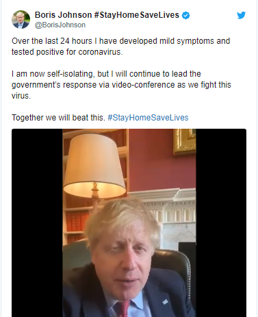 Son olarak İngiltere Başbakanı Boris Johnson'ın koronavirüs test sonucu pozitif çıktı. Johnson, ilk açıklamasında "Testim pozitif çıktı, kendimi karantinaya aldım. Virüsle savaşıp telekonferansla kabineyi yöneteceğim" ifadelerini kullandı.