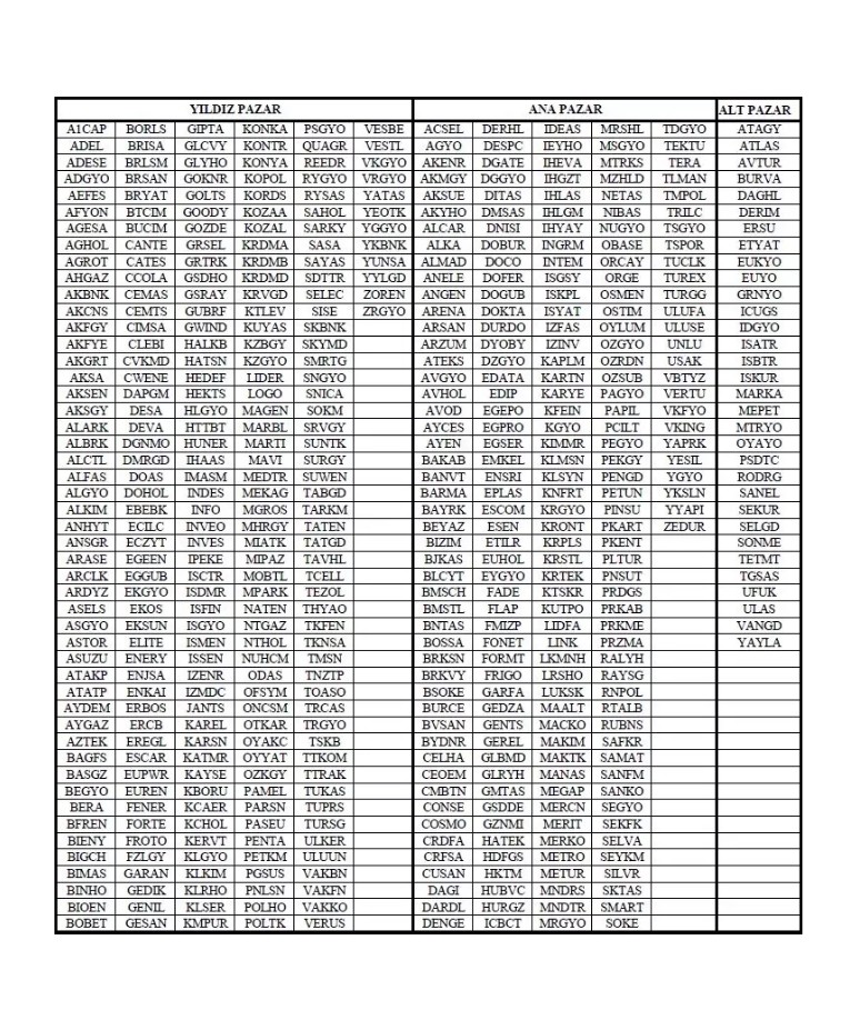 Yeni yılın gelmesiyle birlikte 02/01/2024 tarihinden itibaren Yıldız Pazar, Ana Pazar ve Alt Pazarda işlem görecek payların dağılımını ve pazarları değişen payları gösteren tablolar şöyle: