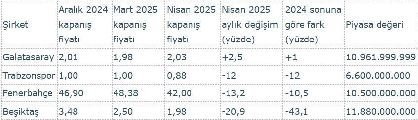 Borsa'da işlem gören 4 spor şirketinin Aralık 2024, Mart 2025 kapanış fiyatı, Nisan 2025 değişimi, 2024 sonuna göre farkı ve piyasa değeri şöyle: