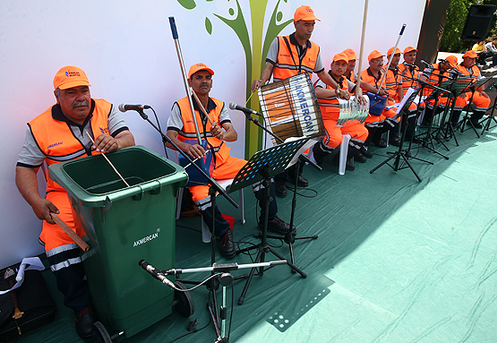 Çöpçüler konserde saz, gitar, davul gibi enstrümanların yanı sıra çöp bidonu ile kovası ve kürekle de ritm tutarak vatandaşlara eğlenceli anlar yaşattı.
