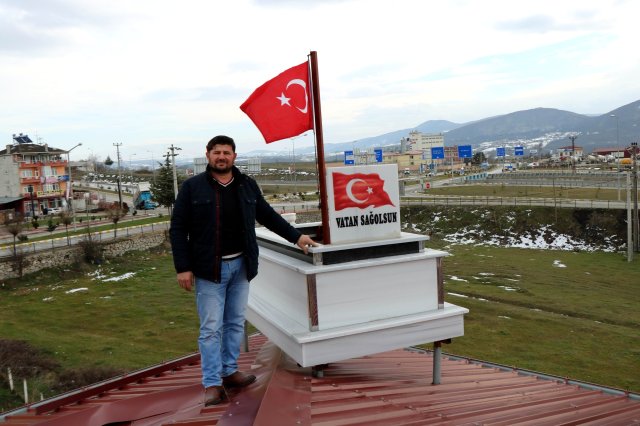 Çatının üstünde yer alan mezarın üstünde de Türk bayrağının yanı sıra, "Önce Vatan" ve "Vatan Sağolsun" ifadeleri yazıyor.