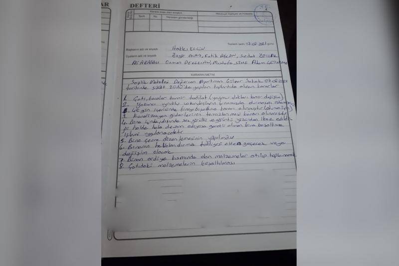 7 Ağustos'ta apartmanın sorunlarını çözmek için binada toplantı yapıldı. Toplantıda 8 karar alındı.